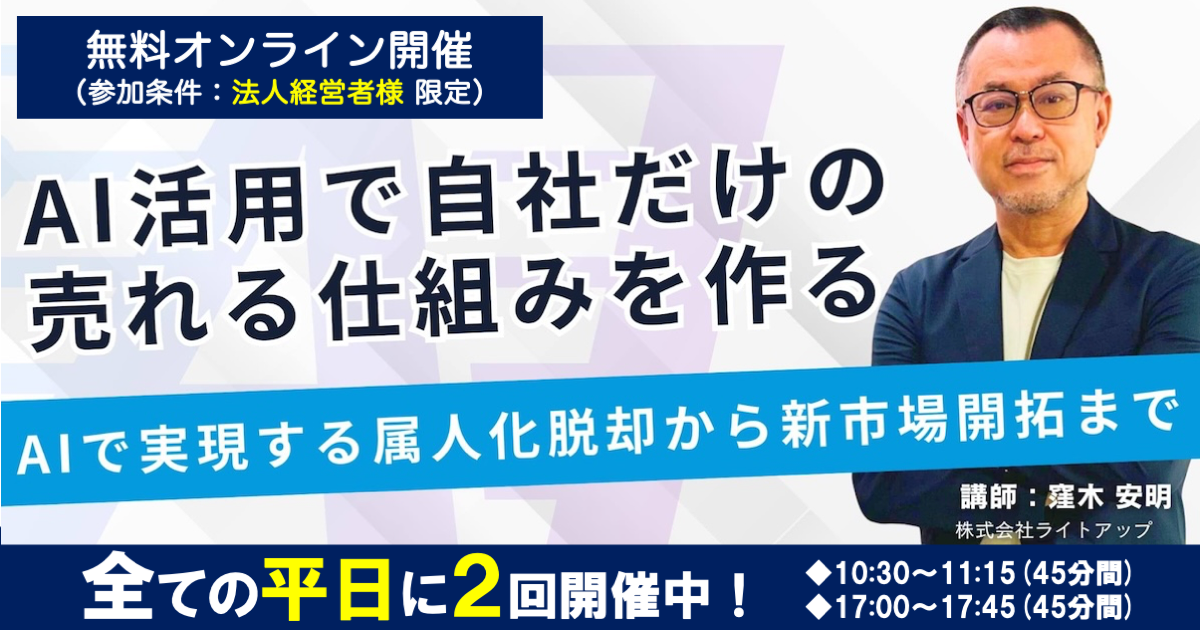 | 備考 | 本セミナーは、【株式会社ライトアップ】が主催いたします。 |