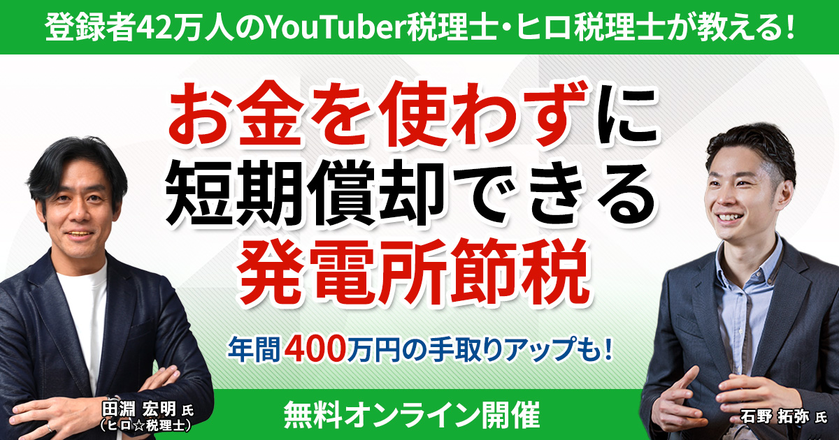 YouTube42万人のヒロ☆税理士が登壇し、資金や手間がかからない「太陽光節税」について解説します。