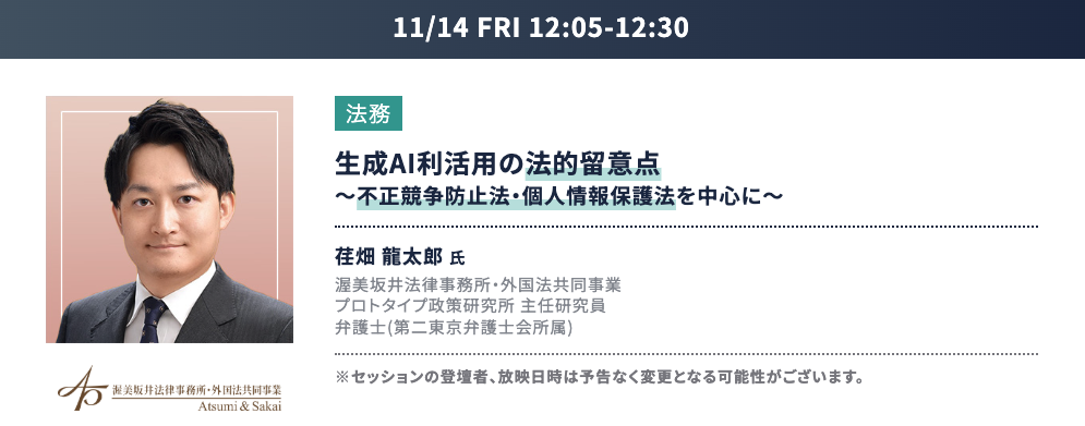 その中でも特にオススメしたいのが、11/14(金)に配信予定の「生成AI利活用の法的留意点」に関する講演イベントです。