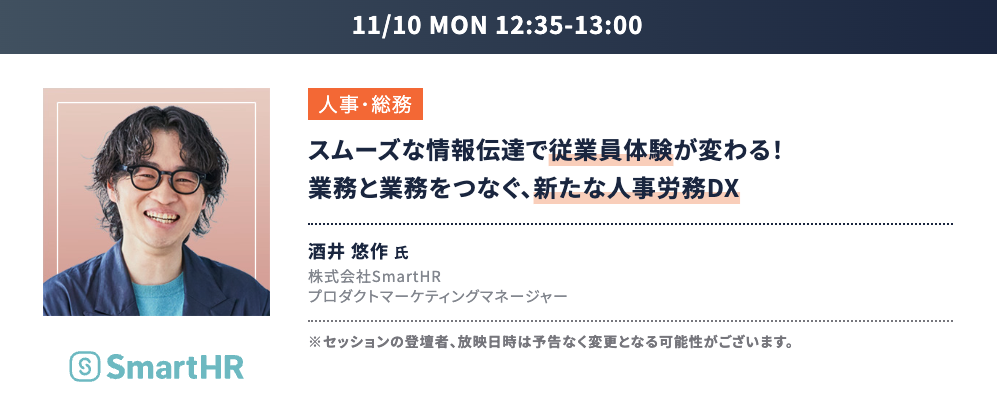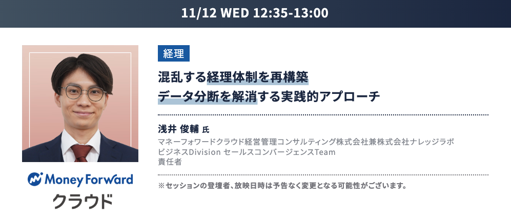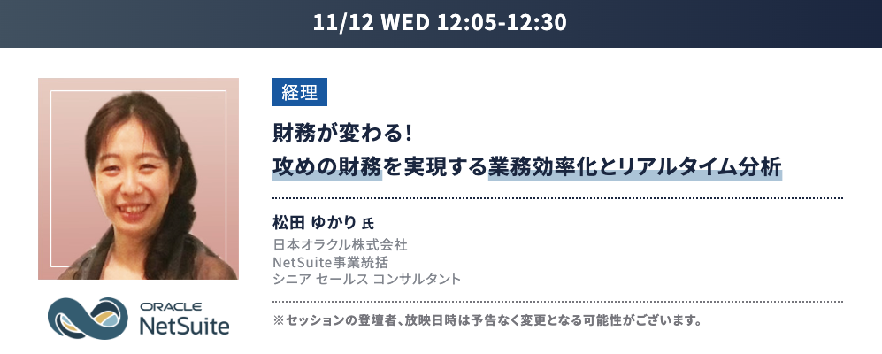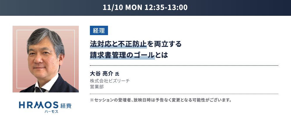 11/10(月)12:35〜13:00に開催する、「法対応と不正防止を両立する『請求書管理』」をテーマにした以下の講演です。
