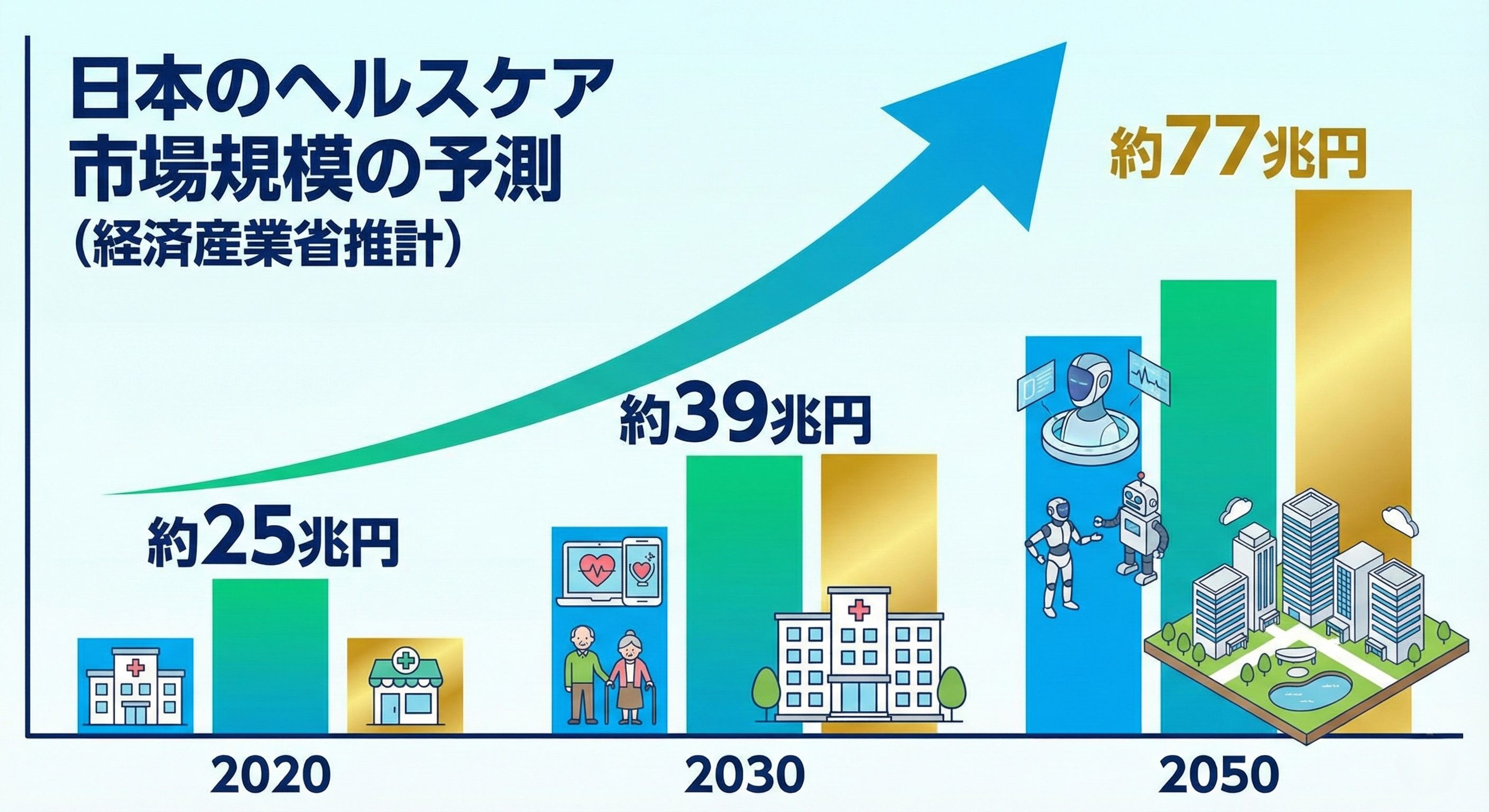 経済産業省の推計によれば、日本のヘルスケア市場規模は2020年の約25兆円から、2030年には約39兆円、そして2050年には約77兆円へと、急速な拡大が予測されています。