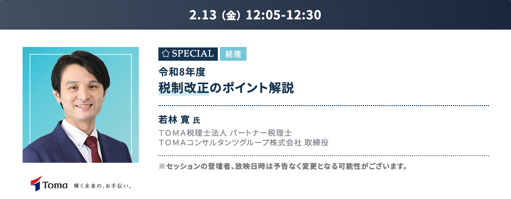 その中でも特にオススメしたいのが、2/13(金)12:05-12:30(25分間)に配信する、令和8年度の税制改正ポイントを解説する講演です。