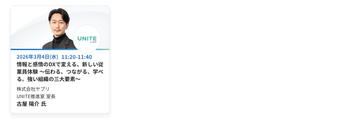 | 会場 | 【オンライン配信】 本イベントは「BOXIL EVENT CLOUD」というツールを使用してオンライン開催します。 ※お申込いただいた翌営業日の朝9時頃にご登録のメールアドレスへ下記の送信元、件名でご案内をお送りいたします。 イベント参加に利用する「BOXIL EVENT CLOUD」のご参加用URLを記載したメールですので、メールに記載のリンクからメールアドレス認証やパスワード設定等をお済ませください。 ------------------------------------------------------------------------------------- 【今回はじめてBOXIL EXPOにご参加いただく場合】 ・送信元:BOXIL EVENT CLOUD (noreply@boxil-event-cloud.jp) ・件名:【重要】「BOXIL EVENT CLOUD」メールアドレス認証のお願い 【今回のご参加が2回目以降の場合】 ・送信元:BOXIL EVENT CLOUD (noreply@boxil-event-cloud.jp) ・件名:【重要】イベント申込の御礼と視聴予約のお願い|BOXIL EXPO 人事・総務展 2026 春 ------------------------------------------------------------------------------------- |