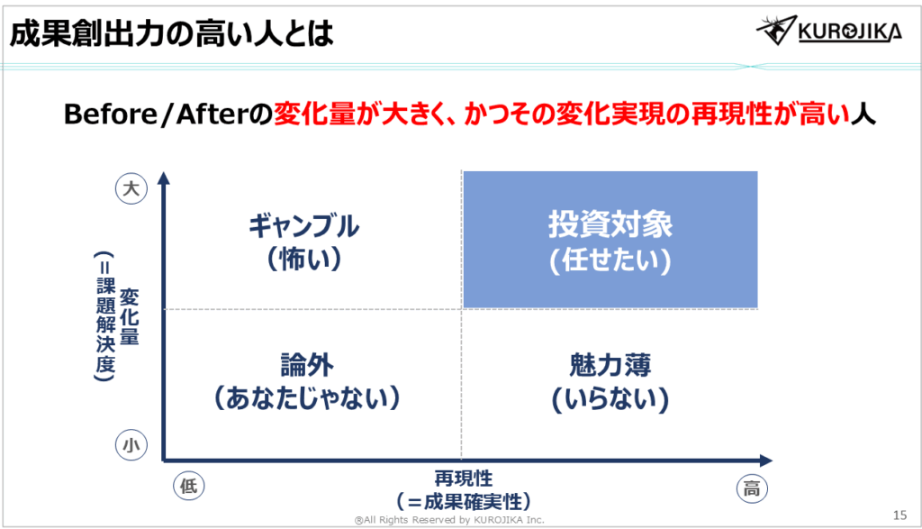 具体的には、下記にお示しする「Before/Afterの変化量(課題解決度)が大きく、かつ、その再現性(成果確実性)が高い人」です。